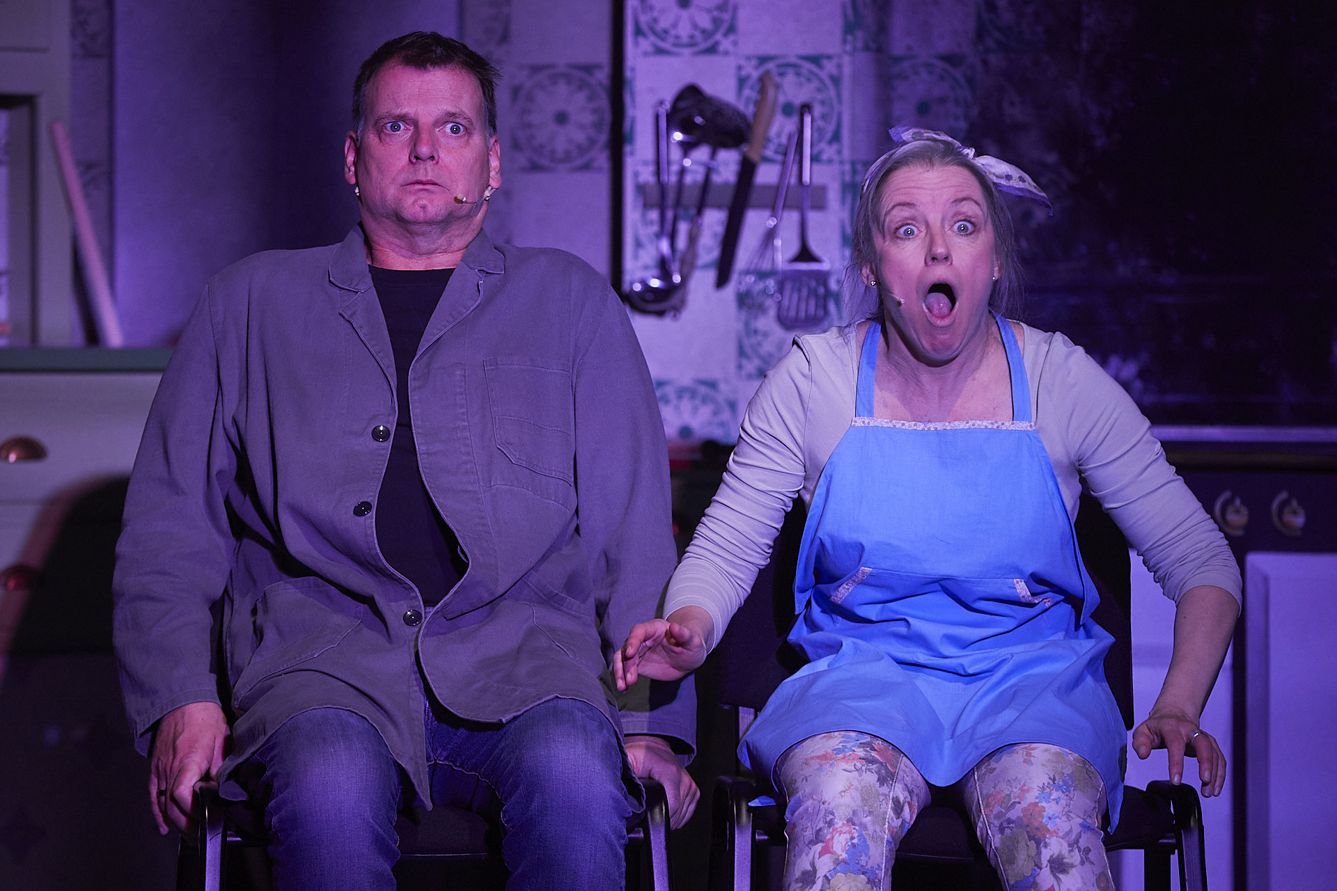 Und so beginnt ein vergnüglicher Abend, für den Kruppa und Markus Weise als Autoren verantwortlich sind. Maria und Rainer lassen nichts aus; Komik entwickelt sich dabei mit Leichtigkeit aus dem Aufeinanderprallen der beiden Perspektiven. In welchem Bühnenbild Jamry und Kruppa spielen, ist übrigens vollkommen gleichgültig. Das gut eingespielte Duo kommt mit wenigen eigenen Requisiten aus. Zwei Stühle bilden ein Kino, zwei grün-weiße Schals schaffen Stadionatmosphäre – alles unterstützt durch ein simples, aber höchst wirkungsvolles Lichtkonzept. Auf Fingerschnippen wechselt die Lichtfarbe, einfach dadurch wird die Illusion wechselnder Schauplätze erzeugt. Dieser Minimalismus funktioniert prächtig und bereitet Jamry und Kruppa Räume, in denen sie sich austoben können. Räume, die beide auch nutzen. Zudem wechseln sie gern von der Bühne in den Zuschauerraum und ziehen singend durch die Reihen. Die Nähe kommt an, das Publikum lässt sich bereitwillig zum Mitsingen animieren. Der Abend trägt streckenweise Züge einer Schlagerparty. Von Jürgen Marcus bis Wolfgang Petry. Wahnsinn.